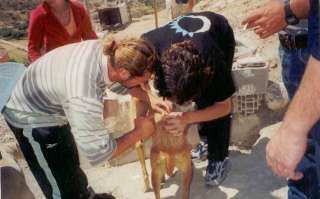 Next day, we went to another town, and guided by locals, made our way up a hill to find more galgos. On arriving at the top, we saw nothing except what looked like a rubbish tip. We could just make out, amongst the strewn litter, roughly made wooden and other containers. Then as we approached we saw dogs chained to the rocky ground. There were no floors to the boxes which were just three panels over rough rock.. The fear on the dogs, faces as we approached, reflected their experience of humans, and knowing how unaggressive greyhounds are, such a reaction makes this work almost unbearable in its reality and pathos. We started cajoling them immediately with food, and applying the antiparasitics. There were four dogs free – one very lame, unable to put his hind leg to the ground. They wouldn’t touch the food until we moved away. There were two sets of pups with mothers. One litter of pups was penned up. The mother’s collar was so tight that her neck was bleeding and the collar could not be loosened except by cutting it off. I had given away all my collars the evening before so Maria went to the village to buy a collar while I continued to apply the Flea Halt. One longhaired black galgo, chained to the top of a metal sheet over another shelter, barked anxiously with fear and apparent aggression. I spent a half hour carefully and slowly approaching him from the ground until at last I was able to embrace him and apologise for the failing of the cruellest species of all – man – but what good would it do? Maybe this would be the only embrace he would ever have in his harsh life. There were more pups under this metal sheet. Three of them came out, but inside, in the dark, I could just make out the shape of another – was it dead? The entrance was very narrow and I could only crawl in on my stomach and I reached out to touch the body. It was warm and I was able to drag it out. It was sick; the stomach distended to bursting point with worms and the heart beating very fast. Maria returned. There were no collars in the town. We emptied my holdall, hiding the pup inside it and Maria took it back to the car where there were many people – hoping and praying that the little pup would not make a sound and be discovered. She succeeded. She took the pup to her vet where she would be safe now, treated and exported to a home, probably in Holland.