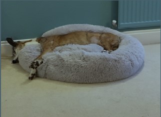 Another really useful type of bedding is Vetfleece. This is a type of thick fleecy mat that is easy to wash. They come in lots of colours and sizes with the option of anti-slip backing. They have many uses, perfect if you have lots of tiled, wood or laminate flooring, great in the back of the car or on the backseat, easily rolled up and carried to visit a friend or out on the patio and ours have made several trips out to the local pub. The mat pictured is 30” x 40” and this seems to work well.