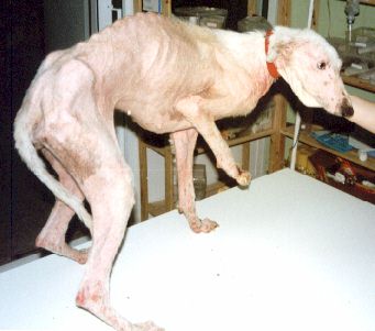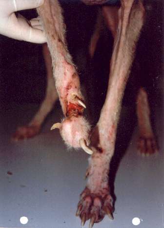 - This is Reina. She is suffering from Leishmaniasis which has become acute due to the extremely poor condition in which this bitch was found. She was found wandering in South Madrid. Her right foot had been caught in a fox trap and was mangled and unrecognizable as a foot. She did not survive.