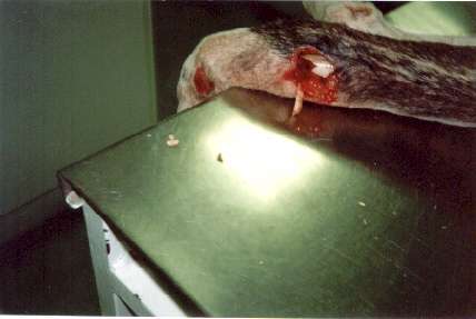 - This greyhound also came from South Madrid. We suppose the foot was caught in a fox trap. The bone is exposed and splintered. It has been pinned and plated by Elena Garcia, a vet in Medina del Campo.