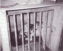 In Spain, racing dogs are kept in cages after the American style of kennelling, but there are differences. The cage in Spain is solid, not of mesh, only one-meter square, and there can be two dogs in each cage, so only one can lie down at a time. Furthermore, the new cages in Barcelona designed by the previous manager of the track are solid on all four sides, and the dog, in solitary confinement, can only be peered at from above by an Anthropoid. Such a psychological abomination can only emanate from a human with no awakening whatsoever to a sense of compassion.